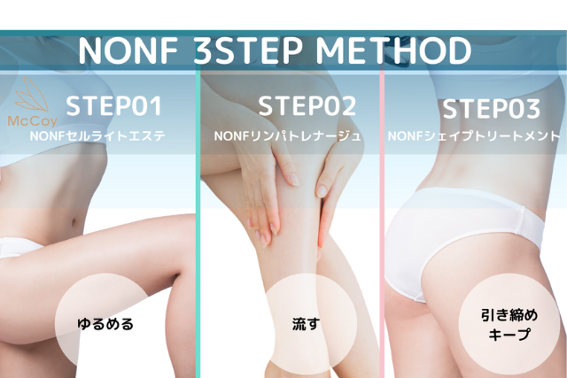 McCoy NONF 3STEP METHODは、マッコイが開発したゆるめる・流す・引き締めるを効率よくサポート。従来のマッサージやトリートメントでは実感しにくかった変化を、短時間で体感できるのが特徴です。